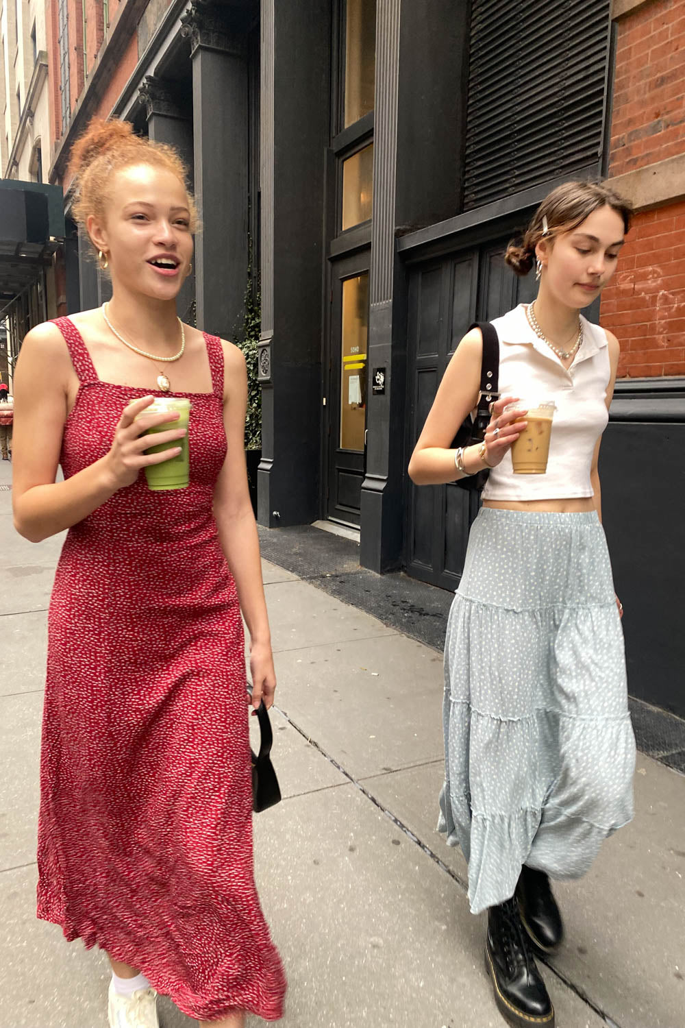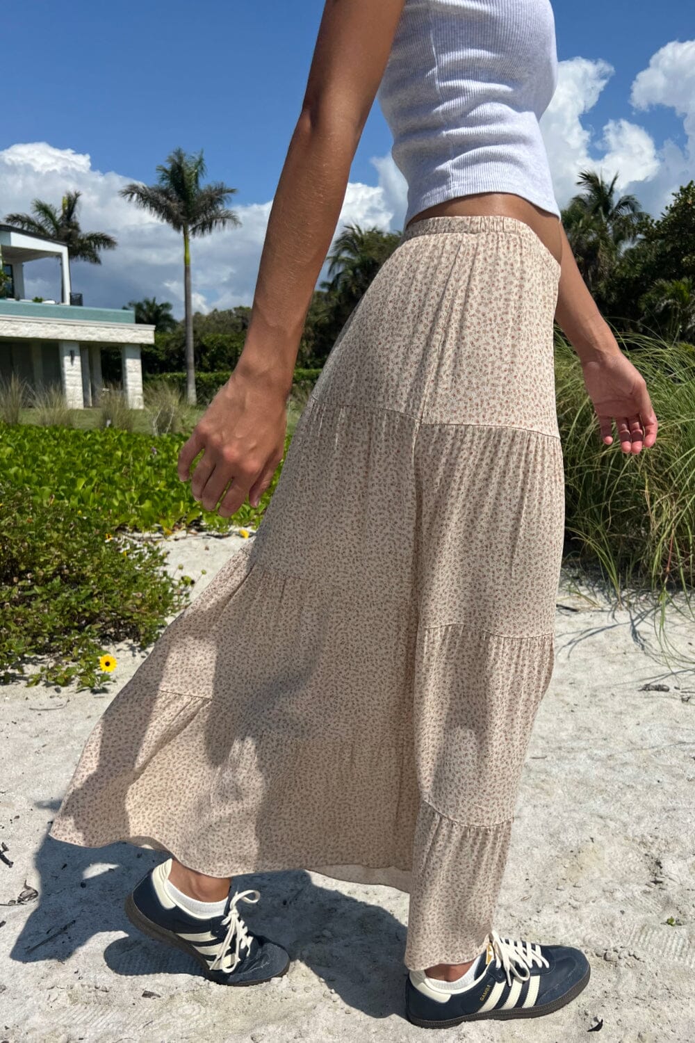 Long, flowy skirt in floral print with an elastic waistband and ruffle detail.